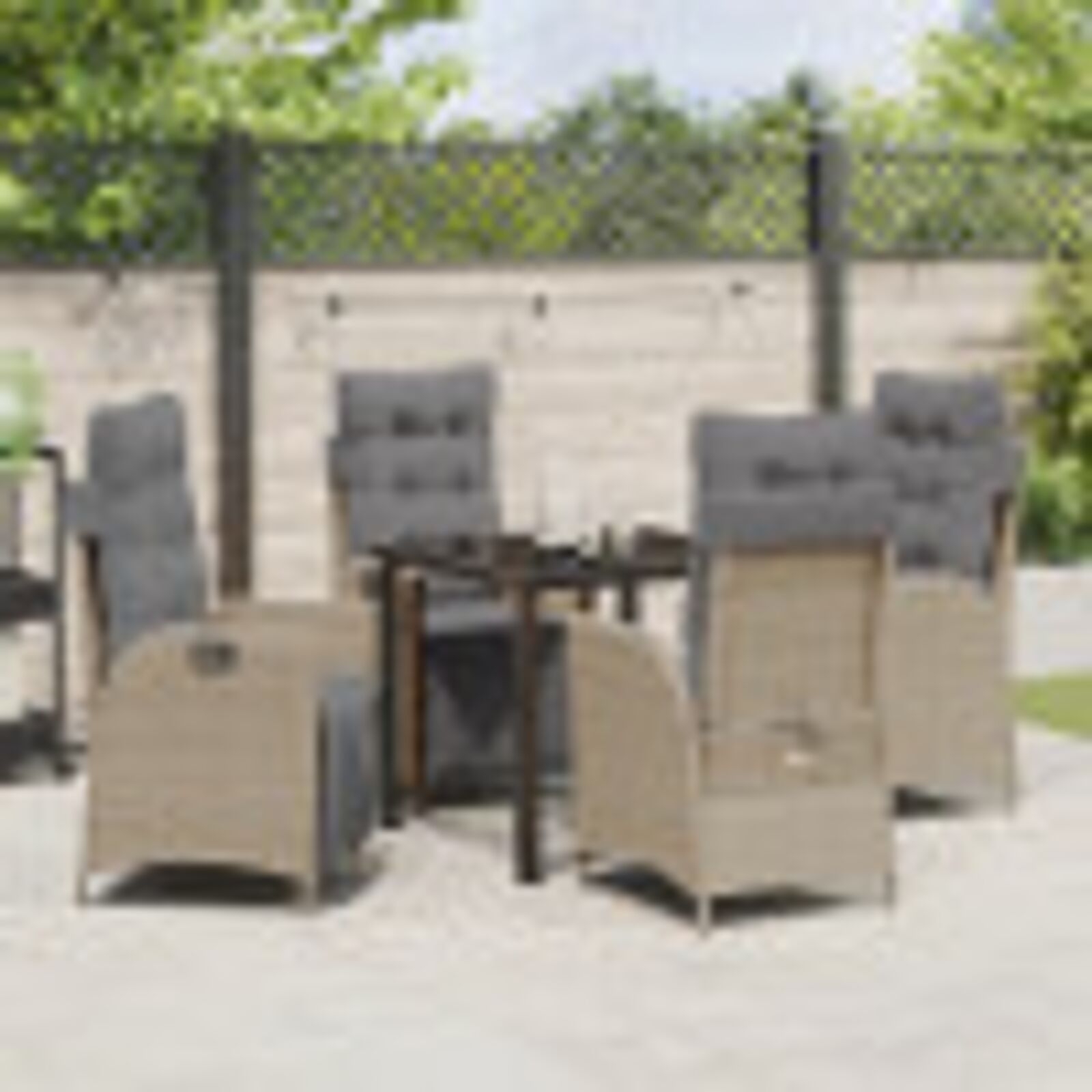 Tämä vidaXL:n nojatuolisetti yhdistää tyylin ja mukavuuden, täydellinen ulkona loikoilusta tykkääville. Tyylikkään beige polyrottinki ja vaaleanharmaiden tyynyjen yhdistelmä piristää mitä tahansa terassia tai parveketta, luoden mukavan paikan rentoutumiseen.