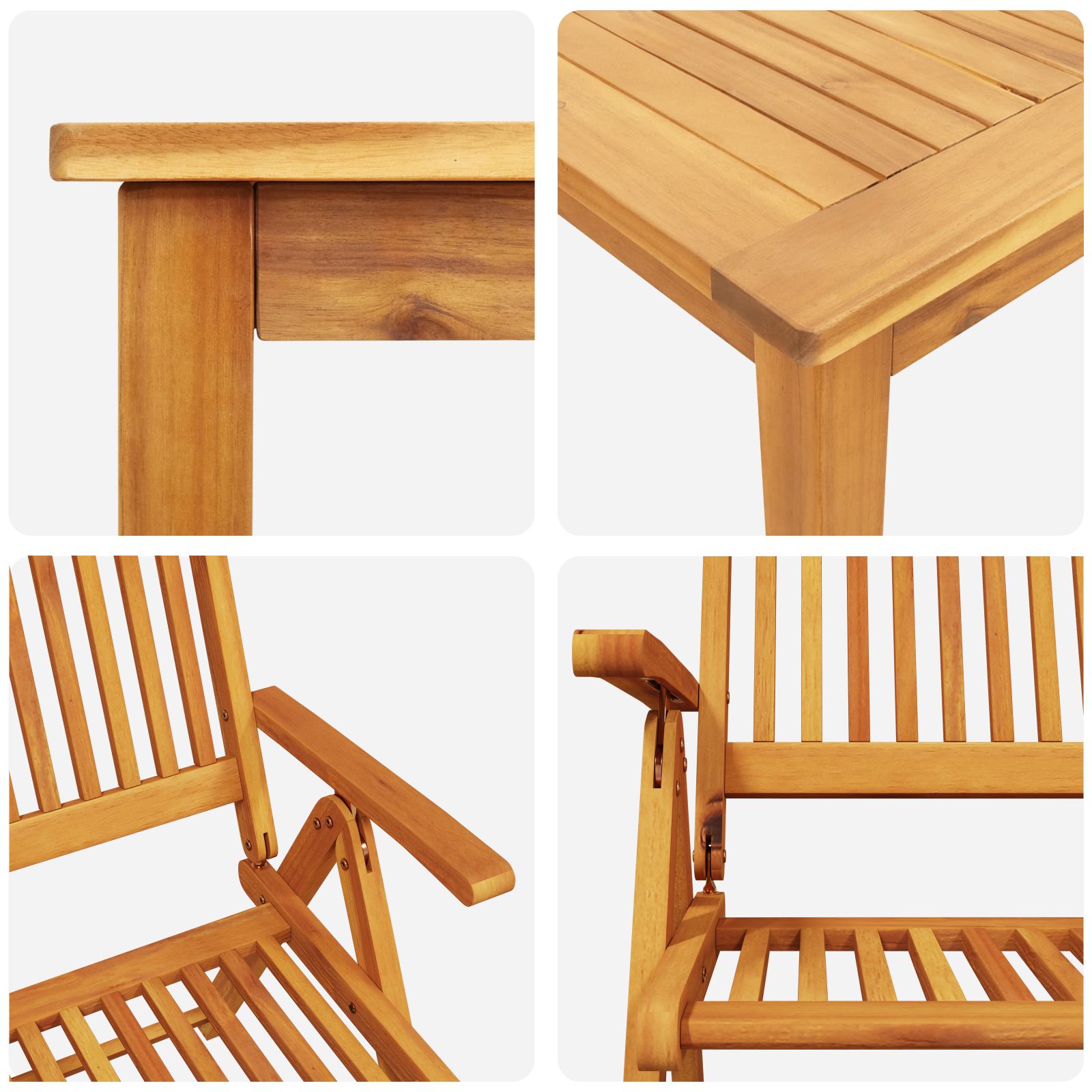 • Premium Materiaali: Kestävä akaasiapu tekee tästä ruokailusetistä tukevan ja valmis kestämään ulkoilman haasteet.