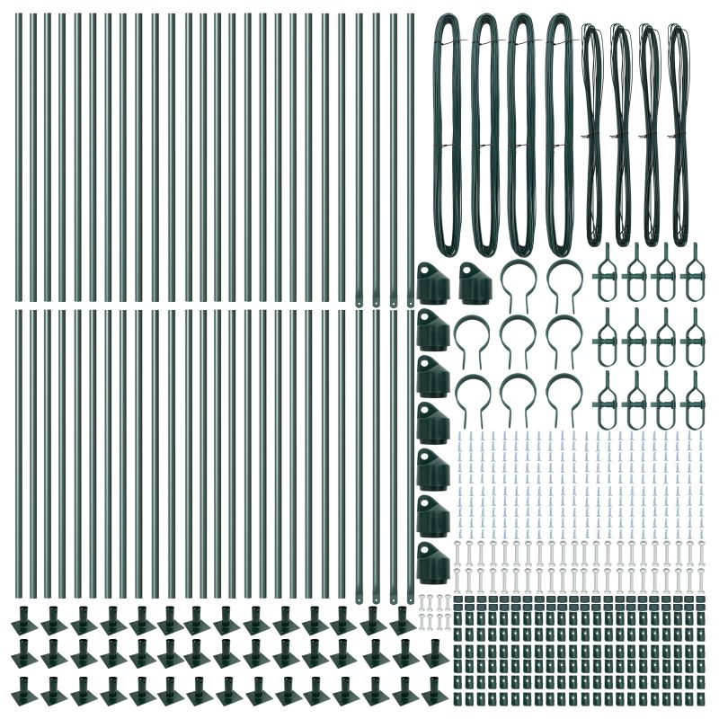 • Delivery Contains: 44 x Pylväs, 8 x Kulmapylväs, 44 x Pohjalevy, 44 x Muovikorkki, 132 x Muovinen jännitteen tukija, 8 x Kulmapostin kansi, 8 x Kulmapostin osat, 12 x Jännitin, 4 x 25 m Sidontalanka, 4 x 80 m Jännitelaa