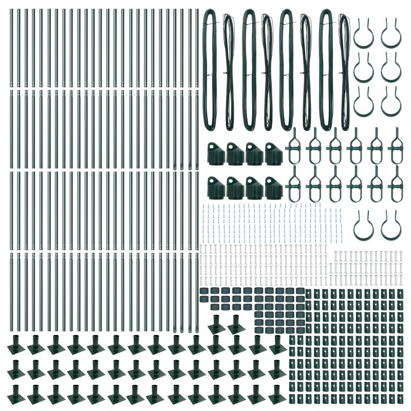 • Delivery Contains: 44 x pylväs, 8 x kulmapylväs, 44 x aluslevy, 44 x muovikorkki, 132 x muovinen jännitelangatuki, 8 x kulmapylväskorkki, 8 x kulmapylväsosat, 12 x jännittäjä, 4 x 25 m sidontalanka, 4 x 80 m jännitelanka