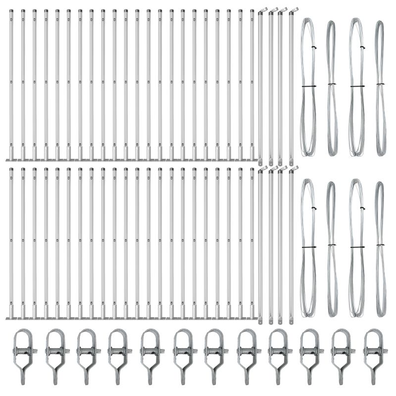 • Delivery Contains: 44 x Pylväs, 8 x Kulmapylväs, 44 x Peruslevy, 44 x Muovikorkki, 132 x Muovinen jännitettävä tukemispala, 8 x Kulmapylvään korkki, 8 x Kulmapylvään kiinnitys, 12 x Jännityselementti, 4 x 25 m Sitouva lanka, 4 x 80 m Jännitettävä lanka