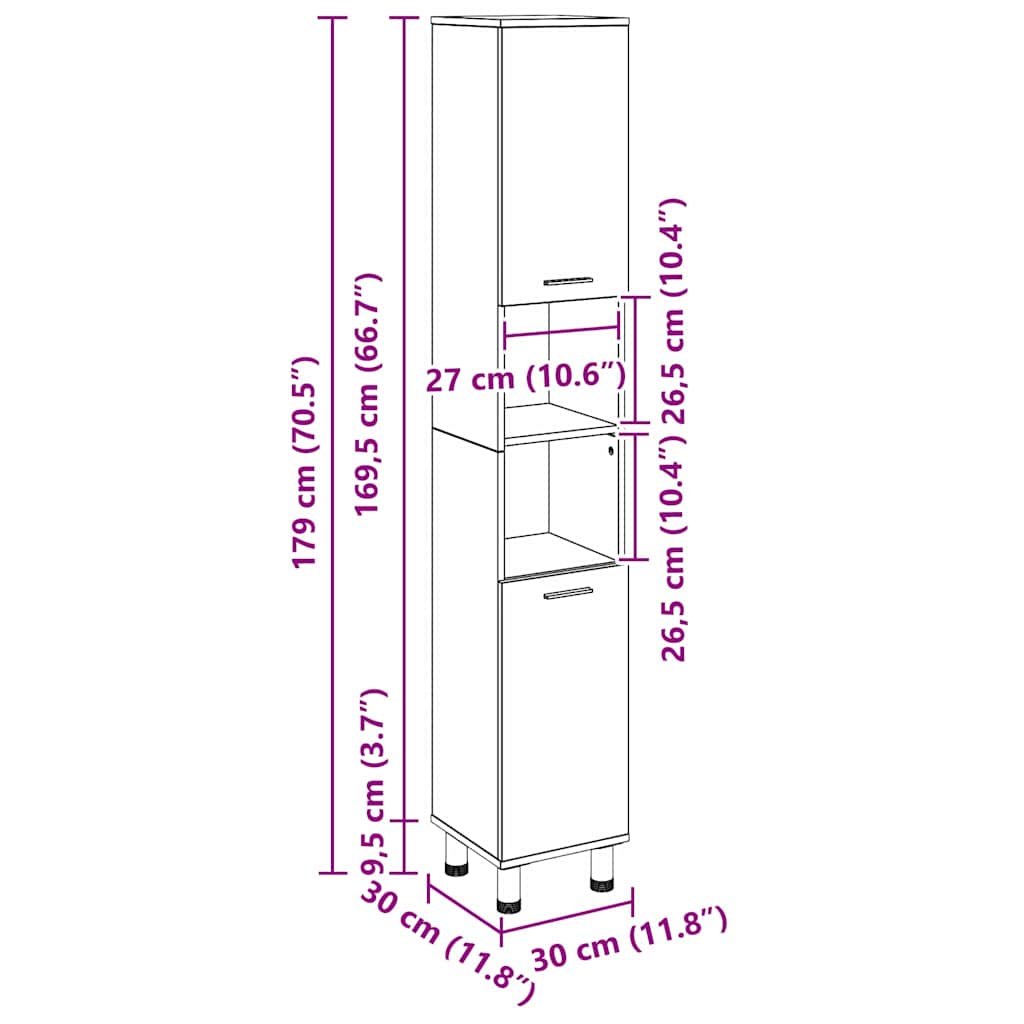 • Mitaten 30 x 30 x 179 cm, se tarjoaa joustavia sijoitusvaihtoehtoja mihin tahansa kylpyhuoneeseen, ollen tyylikäs ja toiminnallinen säilytysratsaus.