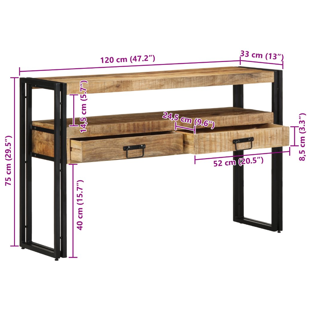 Tämä Teollinen Tyyli Mangopuu Pöytä yhdistää tyylin ja käytännöllisyyden, on moderni kaluste. Valmistettu kestävästä mangopuusta, joka on syvän ruskea, ja vahvalla rautakehyksellä, tämä pöytä on loistava valinta olohuoneeseen, makuuhuoneeseen tai käytävään, lisäten maalaistalon kauneutta ja urbaania tyyliä.