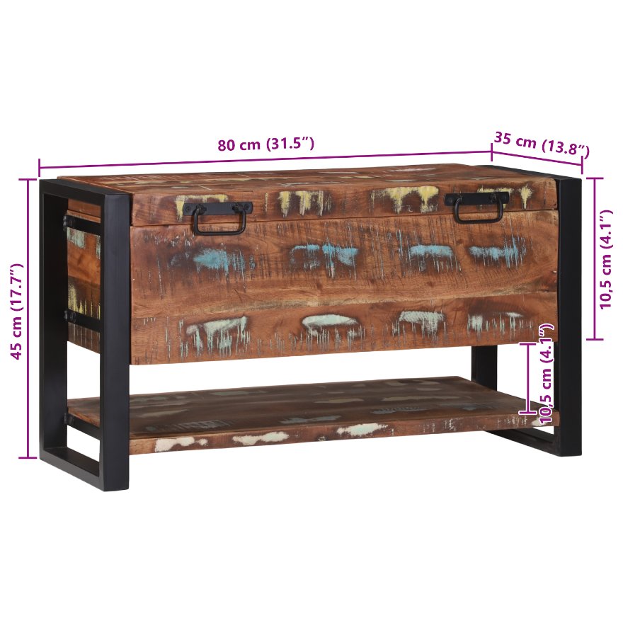 Tämä rustiikkinen säilytyslaatikko, joka on tehty kierrätetystä täyspuusta, yhdistää käytännöllisyyden ja tyylin. Se parantaa elintilasi ja tarjoaa reilusti tilaa tavaroillesi. Loistava esimerkiksi olohuoneeseen, makuuhuoneeseen tai käytävään, sen vintage-vibe sopii mainiosti rustiikkiseen tai moderniin sisustukseen. Se on täydellinen paikkoihin, joissa tarvitaan säilytystilaa esimerkiksi peitoille, leluilla tai kausivaatteille, tuoden lämpöä ja charmia kotiisi.