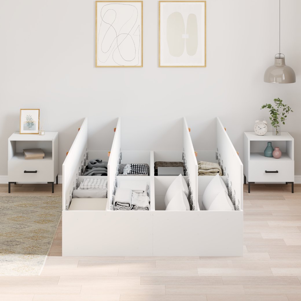 • Tyylikäs säilytys: Integroitu laatikkojärjestelmä auttaa sinua maksimoimaan tilaa tehokkaasti. Se on täydellinen liinavaatteille, vaatteille tai henkilökohtaisille tavaroille ja pitää huoneesi siistinä, samalla kun kaikki on helposti saatavilla.