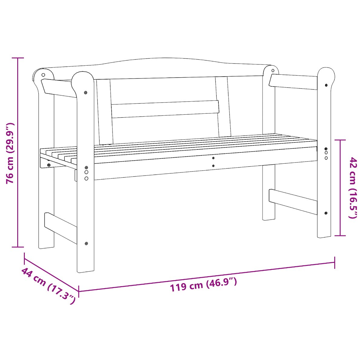 • Mukavat mitat: 118 cm pitkä, 77.5 cm leveä ja 45 cm korkea, tämä penkki tarjoaa hyvin tilaa mukavuudesta tinkimättä, tehden siitä loistavan paikan ulkoilma-aterioihin.