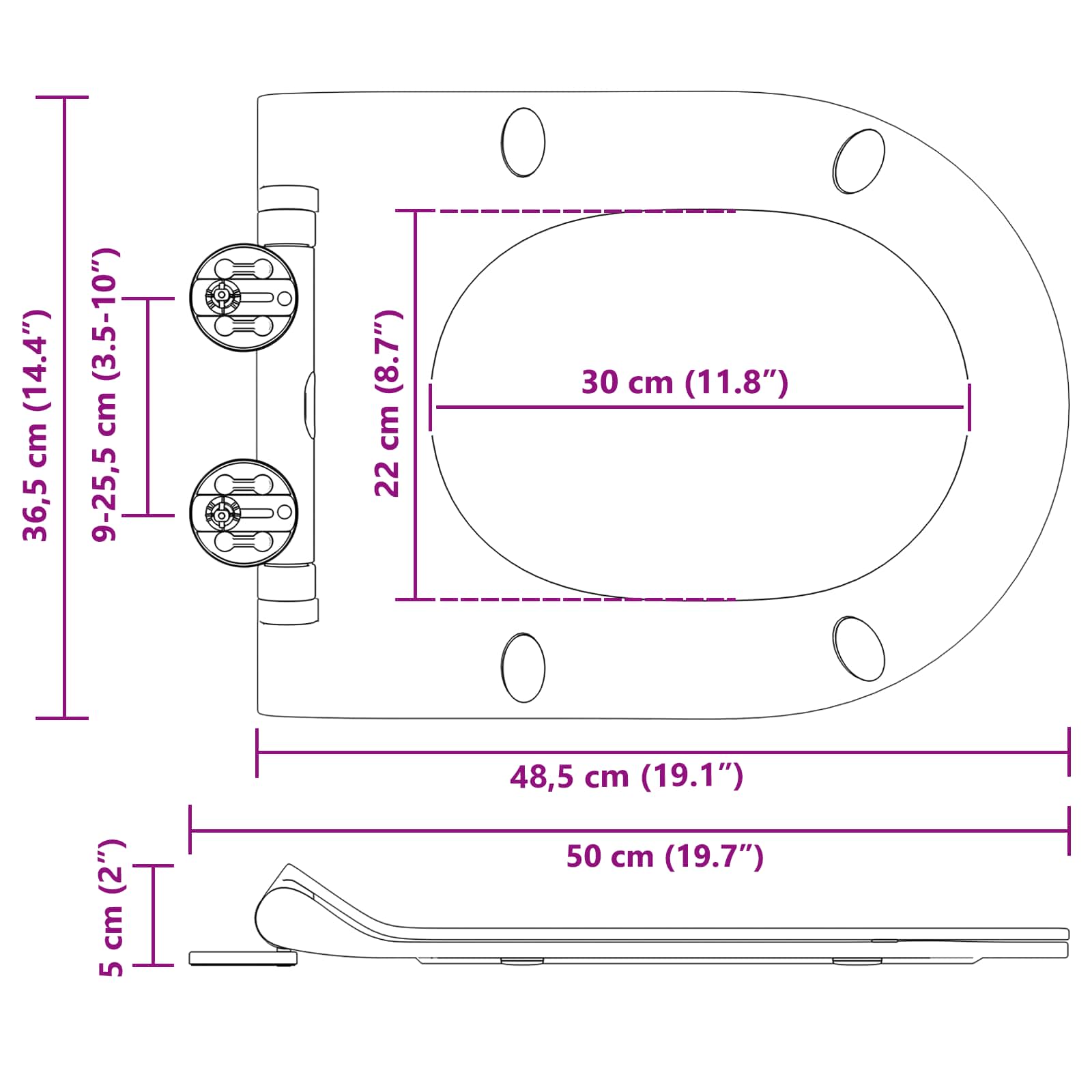 • Lisävarusteet: Kooltaan 48,5 x 36 x 5 cm, tämä tukeva wc-istuinalusta tarjoaa käteviä ominaisuuksia kuten nopeasti irrotettavan mekanismin ja 360° käännettävät saranat. Nopeasti irrotettavan ominaisuuden ansiosta siivous on todella helppoa, kun taas käännettävät saranat auttavat mukauttamaan istuinalustaa mukavuuden maksimoimiseksi.