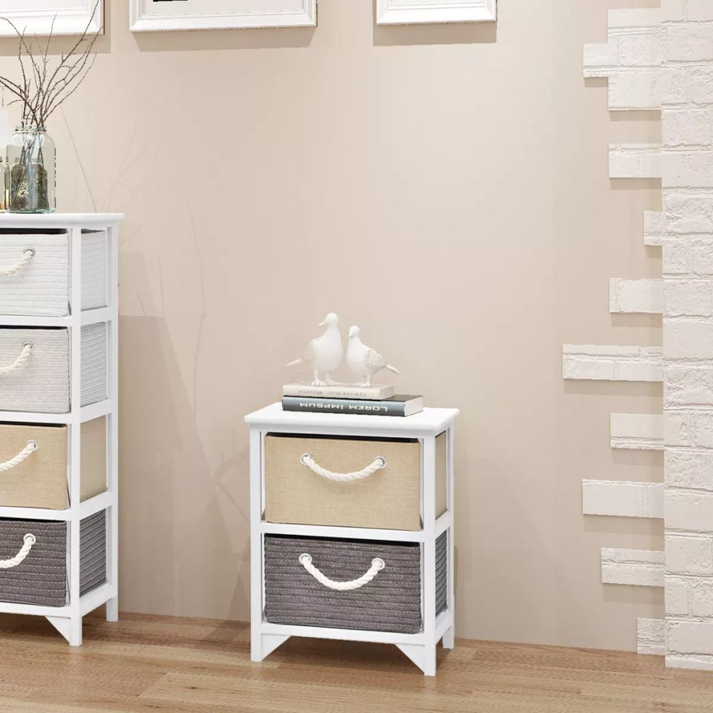 Tässä yöpöydässä on 2 vetolaatikkoa, jotka tarjoavat tilavan säilytystilan pienien tavaroiden järjestykseen ja pitämään ne käden ulottuvilla. Laatikoiden narukahvat lisäävät maalaistyyliä.