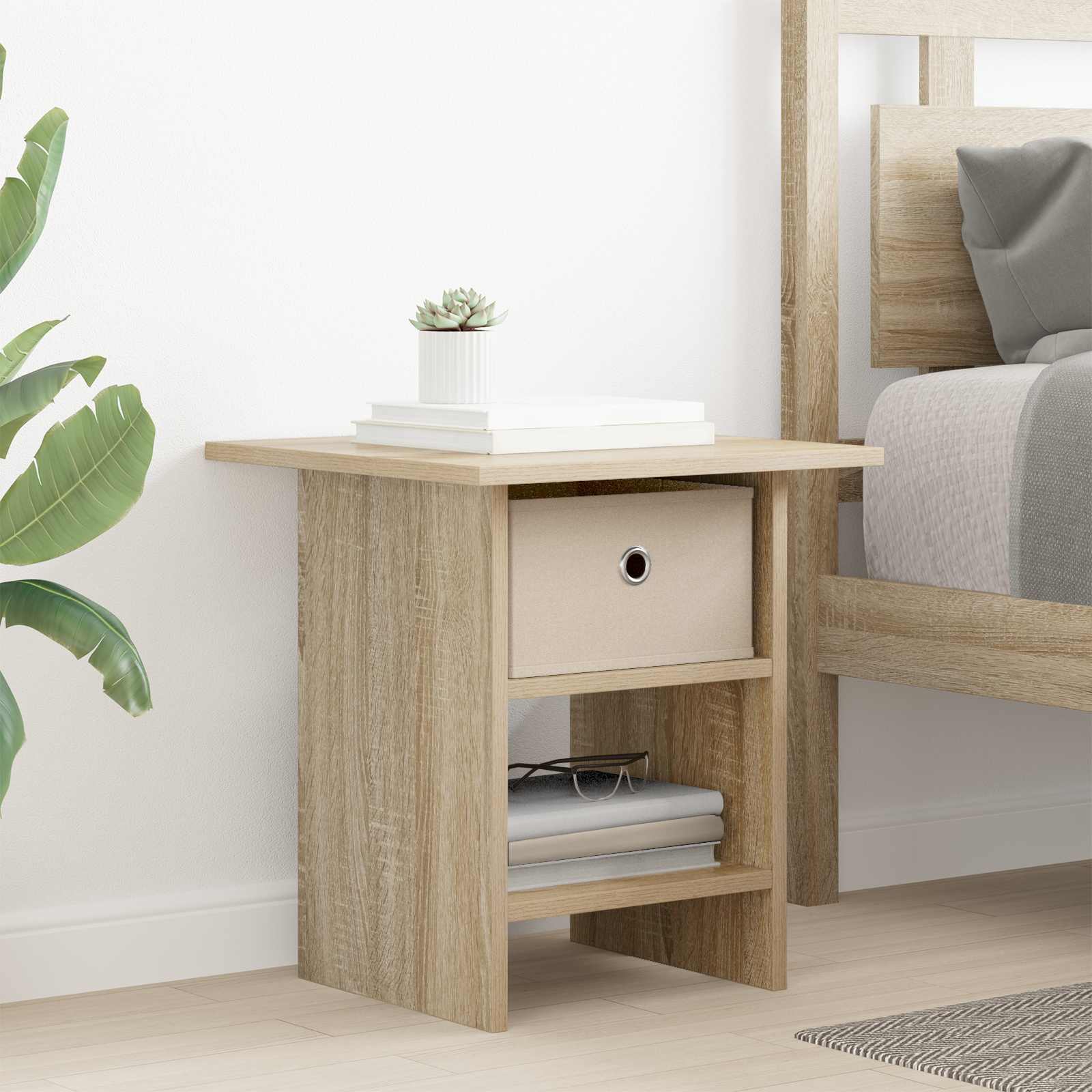 • Runsas säilytystila: Tämän yöpöydän laatikko ja levyhyllyt tarjoavat runsaasti tilaa kirjoille, laitteille ja muille yöasioille. Kaikilla asioilla on oma paikkansa, mikä helpottaa järjestyksen ylläpitämistä.