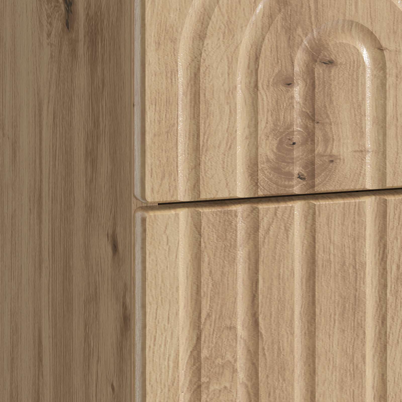• Yksinkertaiset nuppikahvat: Laatikoiden kahvat on suunniteltu yksinkertaisiksi nupiksi, mikä parantaa kaapin modernia ilmettä. Nämä kahvat ovat käytännöllisiä ja koristeellisia, joten laatikoiden käyttö on vaivatonta ja ne antavat elegantin lisän.