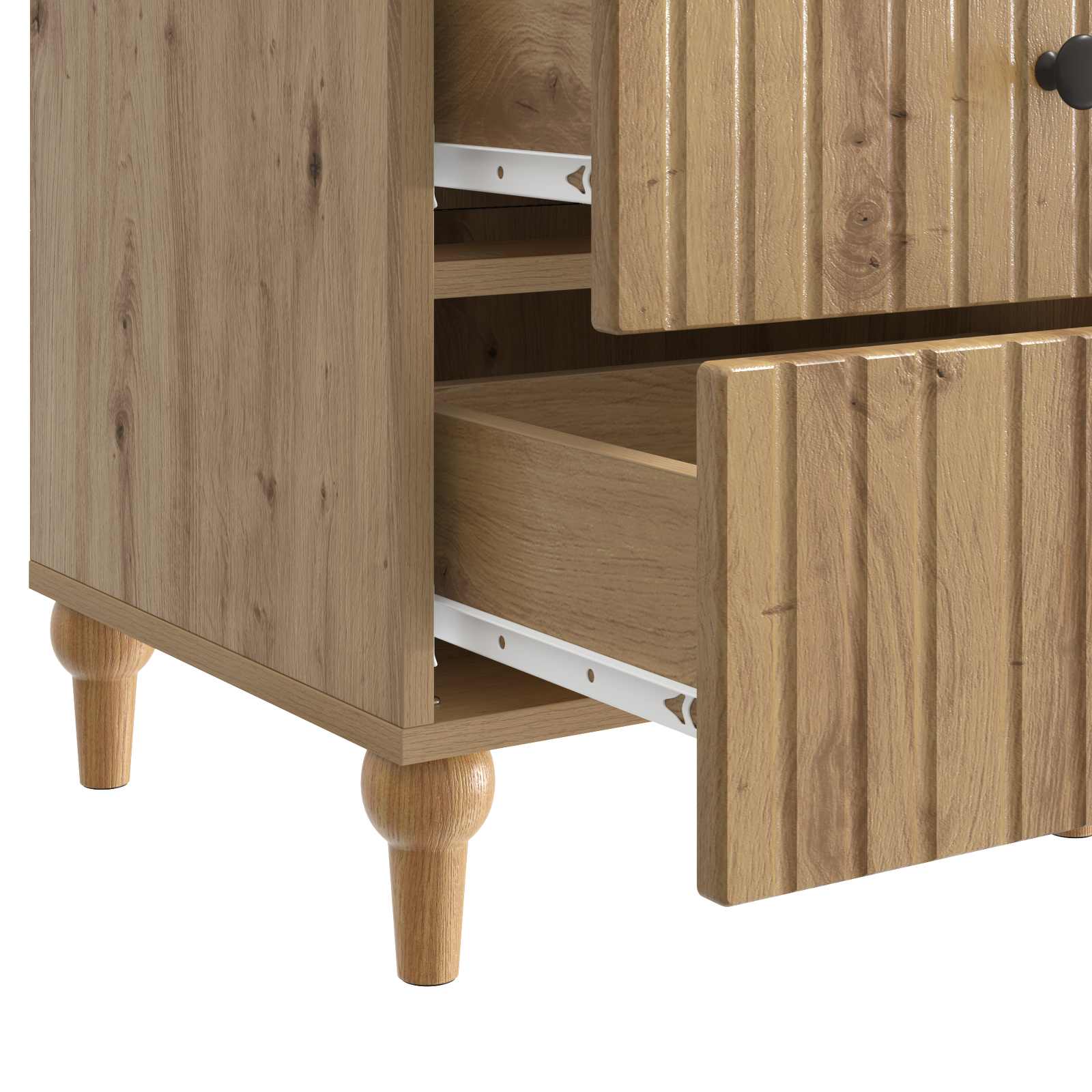 • Vankat metallikahvat: Jokaisessa laatikossa on tyylikkäät metallikahvat, jotka ovat mustat ja kestävät. Ne takaavat mukavan otteen, joten laatikoiden avaminen on helppoa. Kahvojen rohkeat muodot parantavat kaapin yleisilmettä ja lisäävät sen modernia viehätystä.