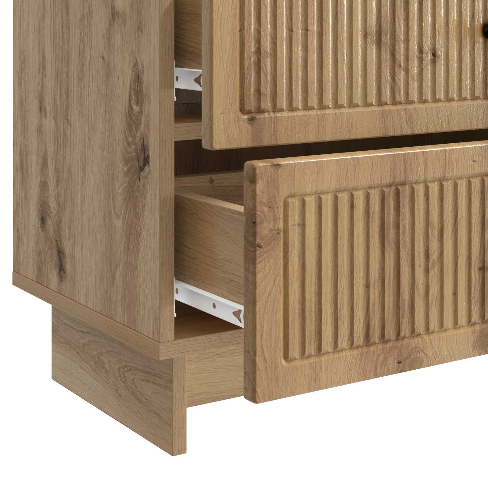 • Tekninen puurakenne Tämä yöpöytäkaappi on valmistettu kestävästä teknisestä puusta, joka takaa pitkäikäisyyden ja tyylin. Materiaali on valittu kestävyyden vuoksi, joten se tulee olemaan osa kotiasi vuosia. Sen lämpimät sävyt ja sileät pinnat tuovat nykyaikaiseen sisustukseen lämpöä ja elävyyttä.
