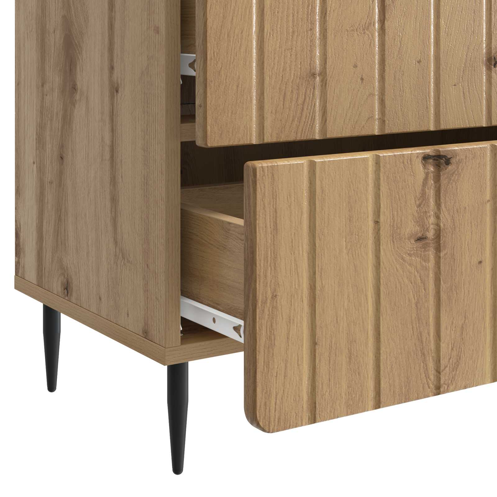 • Modernit rautajalat: Terävät rautajalat tuovat modernin ilmeen ja tukevat muotoa ja toimintaa. Niiden virtaviivainen muoto nostaa kaappia ja helpottaa siivousta sen alta.