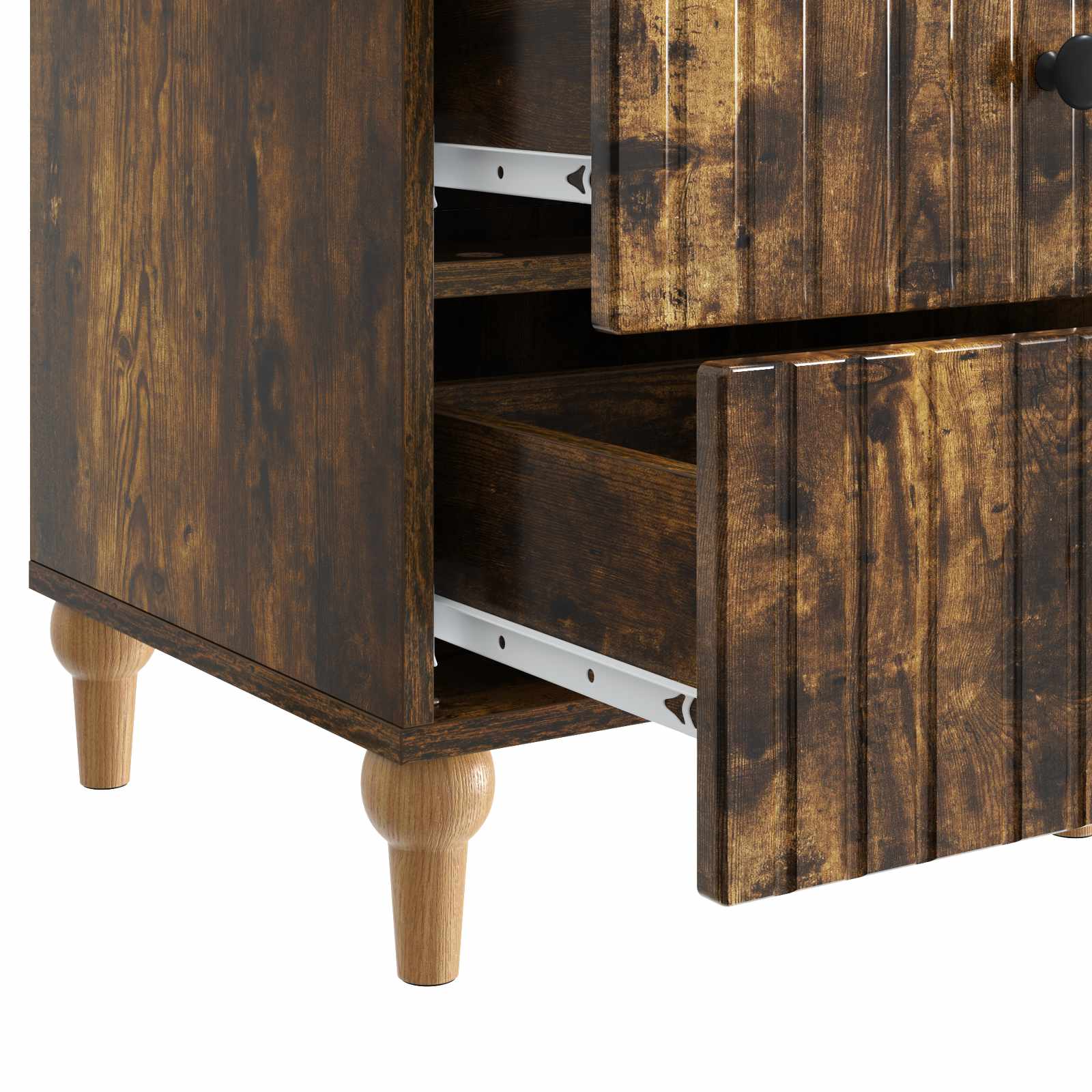 • Vankat metallikahvat: Jokaisessa laatikossa on tyylikkäät metallikahvat, jotka ovat mustat ja kestävät. Ne takaavat mukavan otteen, joten laatikoiden avaminen on helppoa. Kahvojen rohkeat muodot parantavat kaapin yleisilmettä ja lisäävät sen modernia viehätystä.